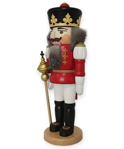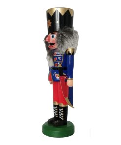 In seiner linken Hand hält der Nussknacker ein goldenes Zepter, das seine königliche Autorität unterstreicht. Das Zepter ist sorgfältig gestaltet und harmoniert perfekt mit seiner prunkvollen Kleidung. Insgesamt ist dieser Nussknacker nicht nur ein dekoratives Element, sondern auch ein funktionales Werkzeug, das Nüsse knacken kann. Er ist ein klassisches Symbol der Festtagsdekoration und verleiht jedem Raum eine festliche Atmosphäre.