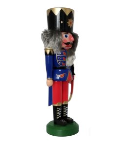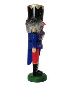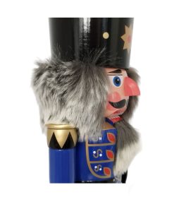 Auf seinem Kopf trägt der Nussknacker König dunkelblau, mittel eine schwarze Krone mit goldenen Verzierungen, unter dem graue, weiche Kunsthaare hervorschauen. Dieser Hut krönt seine majestätische Erscheinung und verleiht ihm eine eindrucksvolle und royale Ausstrahlung, die seine Rolle als König unter den Nussknackern unterstreicht.