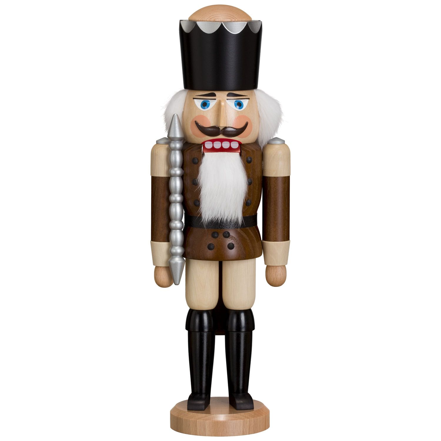 Der Nussknacker König, braun steht auf einem kleinen grünen Podest und verkörpert die traditionelle deutsche Handwerkskunst. Er trägt glänzende schwarze Stiefel sowie naturfarbene Hosen, die mit einer braunen Jacke kombiniert sind. Die Jacke ist reich verziert mit schwarzen Knöpfen, einschließlich silberne Epauletten auf den Schultern, die seine königliche Würde betonen.