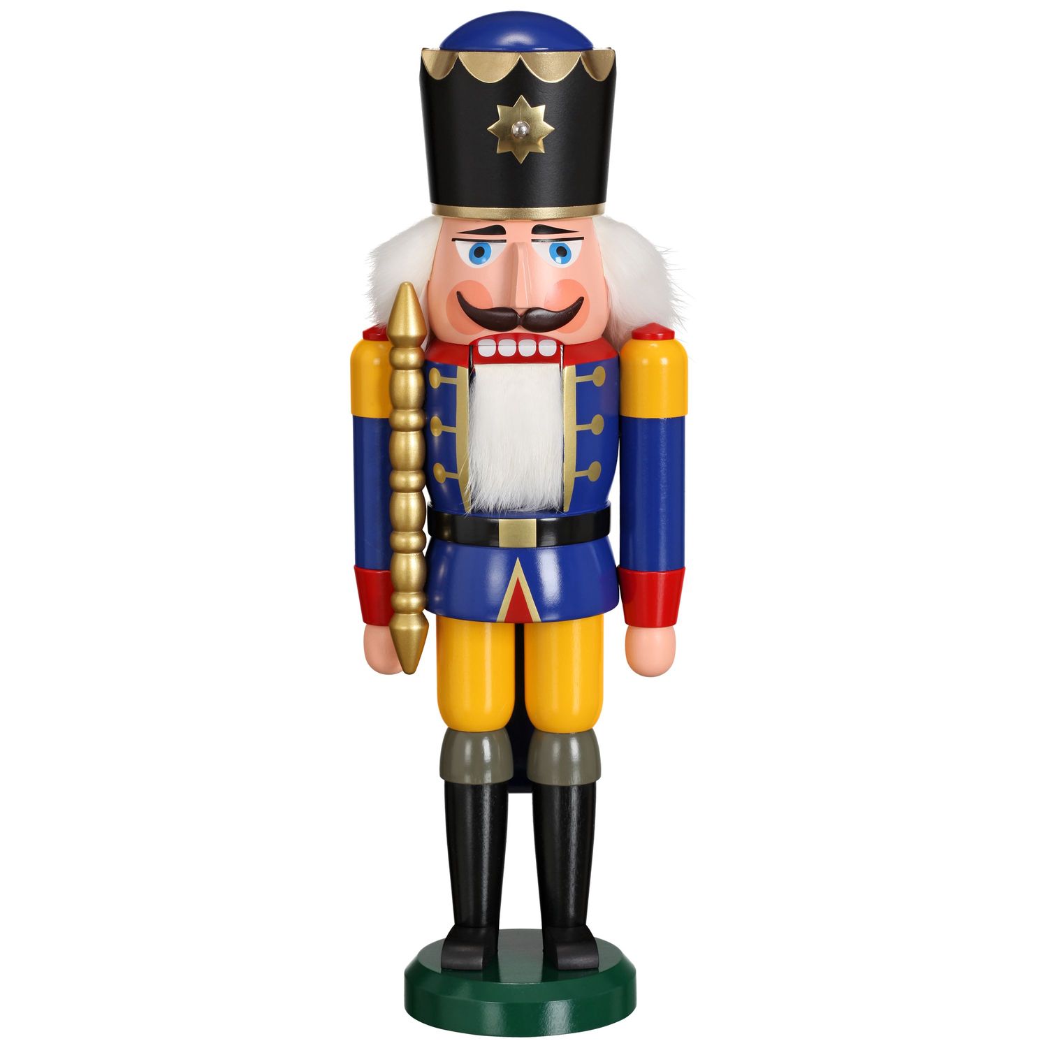 Der Nussknacker König blau steht auf einem kleinen grünen Podest und verkörpert die traditionelle deutsche Handwerkskunst. Er trägt glänzende schwarze Stiefel und gelbe Hosen, die mit einer blauen Jacke kombiniert sind. Die Jacke ist reich verziert mit roten, gelben sowie goldenen Details, einschließlich roter Epauletten auf den Schultern, die seine königliche Würde betonen.