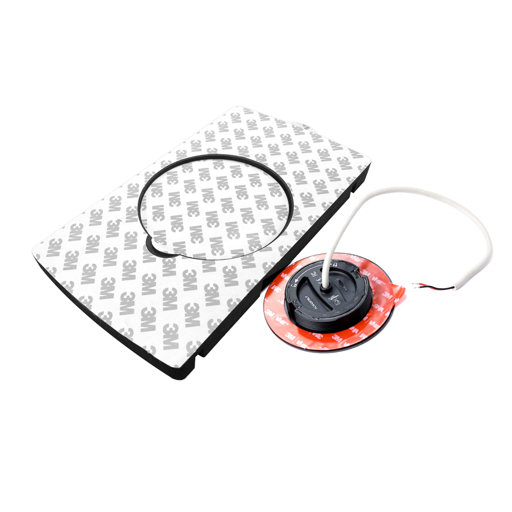 Ein einfacher Schnitt (65mm 2,5″ Lochsäge) an der von Ihnen gewählten Montagestelle, dann einfach das selbstklebende 3M-Trägerpapier abziehen und fest andrücken. Schließen Sie das Gerät an eine 12/24-V-Stromquelle an, und schon sind Sie bereit für Catch. Aufladen. Verbinden.